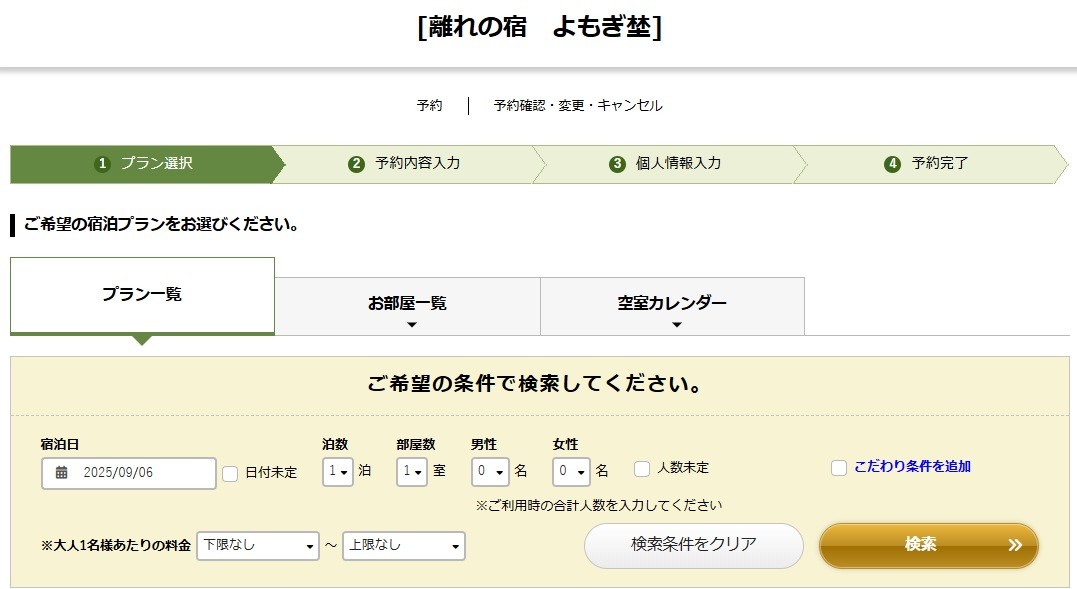 平素より当館をご愛顧賜りまして、誠にありがとうございます。 この度、より快適にご利用いただけますよう、公式サイトの予約システムを一新いたしました。 操作方法に大きな変更はございませんが、旧システムでご予約済みのお客様につきましても、内容はそのまま有効でございますのでご安心ください。 なお、公式サイトで、すでにご予約済みのお客様におかれましては、2025年10月以降のご予約内容の変更・キャンセルは、お電話での対応のみとさせていただきます。 今後とも変わらぬご愛顧のほど、よろしくお願い申し上げます。