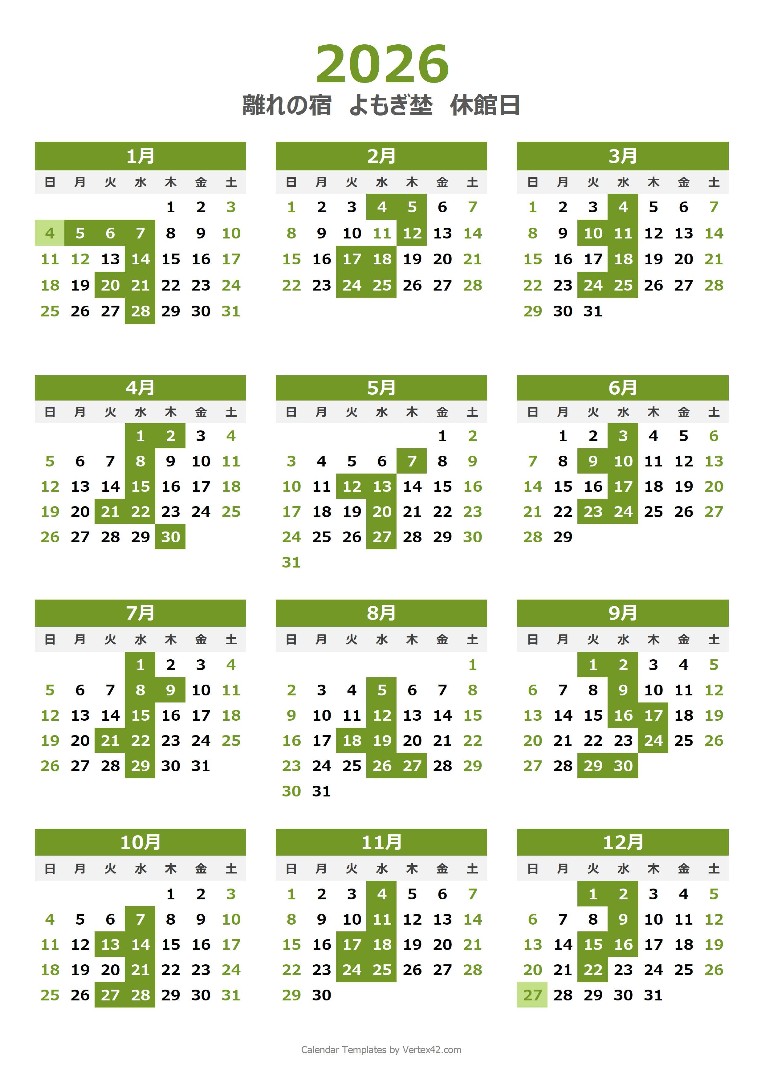本年も離れの宿 よもぎ埜をご愛顧のほど、よろしくお願い申しげます。 さて、2026年の休館日についてご案内申し上げます。(画像をご参照ください) ※休館日は記載日の午後~翌日の午前中までとなります※ ※休館日は予告なく変更する場合がございます。ご了承ください※ 【休館日に際してのお願い】 尚、休館中の電話対応は留守番電話となりますので、 ご用の場合はメッセージをお入れ下さいますようお願い申し上げます。 宿泊や昼和膳などのご予約はインターネットにて承ります。 また、お問い合わせ等のメールにつきましても休館明けに対応させていただきます ※ご予約等のお電話は営業日にお願い申し上げます※